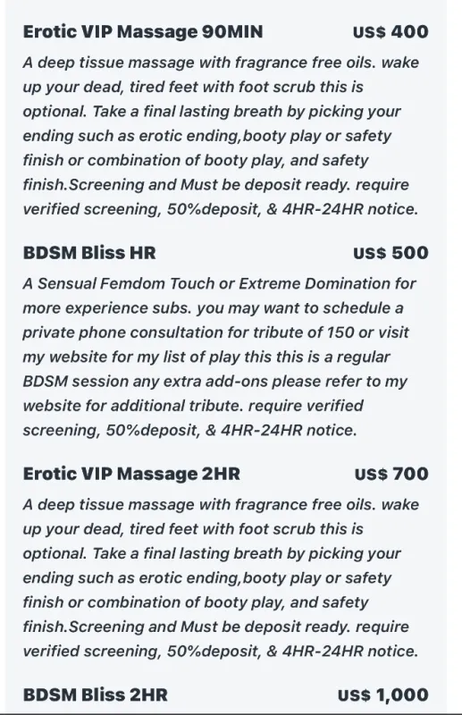 Hi High Caliber Suitors Ova 40 I’m available as early as 6AM and take my last appt at 11PM. I’m not available 24HR. BOOKING ME REQUIRES: Sending Me All the Booking Info Must be deposit ready via cashapp,Venmo,ApplePay,Zelle or PayPal 2HR Notice minimum notice LMA/SQUEEZE IN 📢 There Will Be An Additional $50 Charge For Any Squeeze In Appts aka Last Min Appts. PLEASE NOTE: I ONLY ACCEPT APPTS VIA TEXT MESSAGE. DONT CALL ME CAUSE I WILL BLOCK YOU. I do not reply to incomplete text messages(ie “Hi” “Available” etc). Don’t Be A Timewasters thanks. BOOKING INFO I REQUEST FOR APPT: Name,Age,Race The City You Are In Preferred meeting time & day Type of Appt/Length of your meeting Where did you see my ad Your Place or Mines I am verified and reviewed on many upscale websites, are you Can't wait to get together, Lady Rose Text Only
