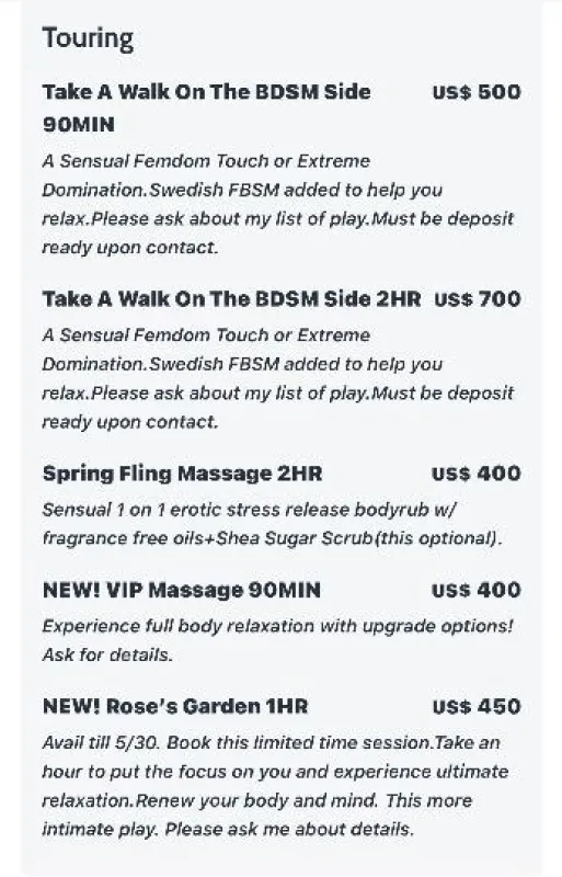 Hi Elite Generous Suitors Over 40! Fort Collins Lady Rose Is Moving! I’m thrilled to announce that I’m transitioning to a new location. My tentative moving date 5/20/25. Make sure to book before I move. Welcome to Rose’s Garden My name is Lady Rose and I'm here to lead you into temptation...I bear all the fruit of the forbidden tree - here we can play, without guilt or shame. There are many choices to pick from here in my garden. Spring Fling Massage 400 2HR Sensual 1 on 1 erotic stress release bodyrub w/ fragrance free oils+Shea Sugar Scrub(this optional). VIP Massage🏆 400 90MIN Experience full body relaxation with upgrade options! Please ask about upgrade details. 🪷Rose’s Garden 450 1HR Avail till 5/30. Book this limited time session. Take an hour or more to focus on you and experience ultimate relaxation.Renew your body and mind. More of an intimate play. Please ask me about details Take A Walk On The BDSM Side 400 1HR|500 90MIN A Sensual Femdom Touch or Extreme Domination.Swedish massage added to help you relax.Please ask about my list of play. All sessions take place in my private and discreet incall located in Fort Collins. You are always welcome to take a shower, using my fully equipped bathroom before and after your session. Text your screening info so you don’t delay your appt. I need 2HR-24HR notice for all appts. All timewasters will be blocked. ⚜Name,Age,Race ⚜The City You Are In ⚜Preferred meeting time & day ⚜Type of Appt/Length of your meeting ⚜Where did you see my ad ⚜My Place or Yours All new guests must be screened for my safety and your security knowing I only see creditable guests. Due to NCNS and time wasters deposits are required via cashapp or Venmo or ApplePay. I’m Verified N Reviewed! Are You 📌 TNA:Lady Christian 📌 P411: P195430 📌Private Delights: ebonyfemdomgoddess Can't wait to get together, •🌹Lady Rose🌹• PS I know life happens I do have a cancellation policy in place feel free to ask about the details of the cancellation policy.