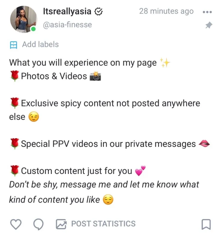 Looking for something a little more personal 💕 i share exclusive photos, playful videos, & behind-the-scene moments you wont find anywhere else! i love chatting with my fans & making things feel fun, flirty, and a little 🤏🏼 addictive. If you enjoy a cute girl with a mischievous side and a lot of surprises, come see what im posting today.... you might end up staying a while 💋 you can check me out on my IG @asiasomoney but subscribe to my onlyfans to chat more with me ❣ @asia-finesse
